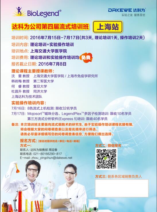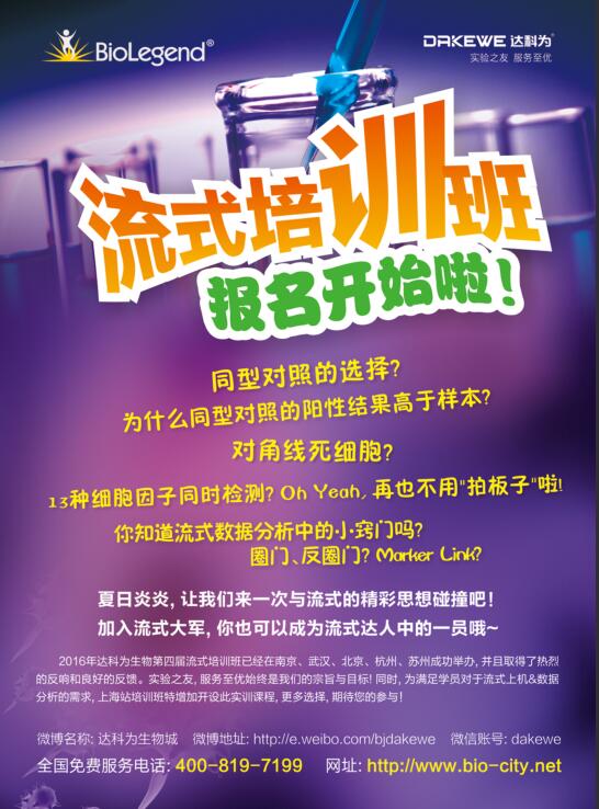 2016年達(dá)科為生物第四屆流式培訓(xùn)班已經(jīng)在全國(guó)各地火熱舉辦中,第七站上海培訓(xùn)班經(jīng)過(guò)前期的彩頁(yè)、海報(bào)的宣傳,報(bào)名工作已經(jīng)接近尾聲。目前上機(jī)課程已滿,理論課程還有部分名額,感興趣的學(xué)員,歡迎報(bào)名,期待您的參與!