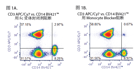 圖1A-B分別為T(mén)ruStain FcXTM阻斷和True-Stain Monocyte BlockerTM阻斷后的CD14 BV421TM和CD3 APC /Cy7共染結(jié)果圖。