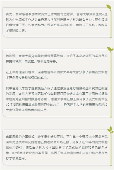 第二日的十色實操日程中,在達(dá)科為流式技術(shù)團(tuán)隊指導(dǎo)下,每位參加的學(xué)員均有機(jī)會自己操作前期染色和后期數(shù)據(jù)處理,并且由深圳先進(jìn)院的詹五根老師演示上機(jī),大家收獲頗豐,參與學(xué)員人數(shù)達(dá)到40余人。