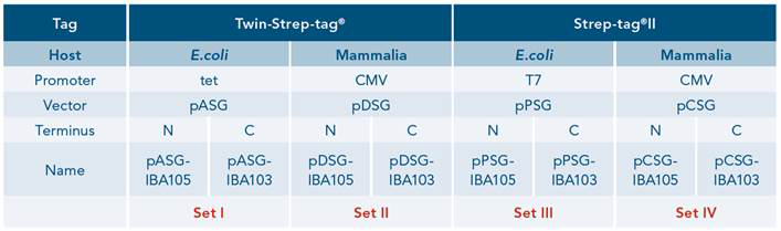 SetⅠ與SetⅡ為Twin-Strep-tag?(三代純化標(biāo)簽),SetⅢ與SetⅣ為Strep-tag?II(二代純化系統(tǒng))標(biāo)簽。每組載體包含兩個1μg帶Amp抗性的載體,分別為Tag在N-Term或C-Term的載體
