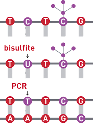 重亞硫酸鹽轉(zhuǎn)化是研究DNA甲基化的金標方法。該技術基于非甲基化胞嘧啶(C)向尿嘧啶(U)的化學轉(zhuǎn)化,即用重亞硫酸鹽處理基因組DNA,非甲基化胞嘧啶被轉(zhuǎn)化為尿嘧啶,而甲基化胞嘧啶不發(fā)生這種轉(zhuǎn)化,從而能夠在單核苷酸水平上確定DNA甲基化(圖1)。轉(zhuǎn)化后的序列可以進行多種分析,包括重亞硫酸鹽測序、焦磷酸測序、甲基化特異性PCR、高分辨率熔解曲線分析、基于微陣列的方法和下一代測序。