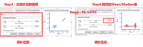 此時(shí)可以手動(dòng)調(diào)節(jié)兩通道之間的補(bǔ)償,該數(shù)據(jù)為FITC單管,可用PE-FITC調(diào)節(jié)FITC滲漏到PE通道去的熒光。步驟如下圖所示:
