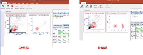 點(diǎn)擊OK,則FITC滲漏到PE通道的熒光被扣除。