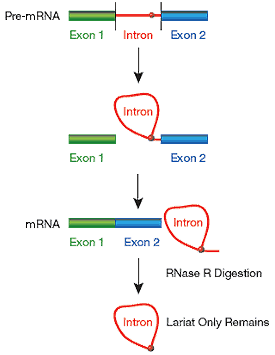 隨著環(huán)狀RNA的深入研究,環(huán)狀RNA制備問(wèn)題就越來(lái)越備受關(guān)注。Lucigen提供大腸桿菌來(lái)源的RNase R,是一種Mg依賴性的3’ →5’核糖核酸外切酶,能消化基本上所有線性RNA,但不消化套索或環(huán)狀RNA的結(jié)構(gòu),或者3’突出短于7個(gè)核苷酸的雙鏈RNA。即是除了tRNA,5S RNA和內(nèi)含子套索結(jié)構(gòu)外,大多數(shù)細(xì)胞RNA都將被RNase R完全消化。如圖4,RNase R可從總RNA中分離出內(nèi)含子前體mRNA剪切產(chǎn)生的套索RNA。以這種方法獲得的RNA作為模板來(lái)生產(chǎn)標(biāo)記的cDNA,可作為含有潛在的內(nèi)含子序列的微陣列的目標(biāo),或者用于包含完整的染色體或者基因組的重疊區(qū)域平鋪陣列。產(chǎn)生的cDNA不代表線性內(nèi)含子,但其含有的序列是來(lái)源于內(nèi)含子的。