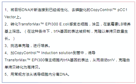 pCC1和pCC2載體含有兩個復制起始位點:單拷貝的大腸桿菌F-因子復制子和誘導型的高拷貝oriV。其中OriV的啟動,需要trfA基因產物,由CopyControl?的另一個重要成分——TransforMax? EPI300 E.coli菌株提供。