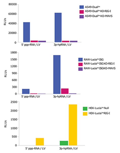 ISG對RIG-I配體的反應(yīng):使用300 ng/ml的5’ppp-dsRNA或30 ng/ml的3p-hpRNA刺激衍生自A549的細(xì)胞;使用1 μg/ml 5’ppp-dsRNA或3p-hpRNA刺激衍生自RAW和HEK293的細(xì)胞。經(jīng)過孵育過夜,可使用QUANTI-Luc?檢測上清中Lucia熒光素酶活性的相對光單位(RLUs)以測試ISG的反應(yīng)。