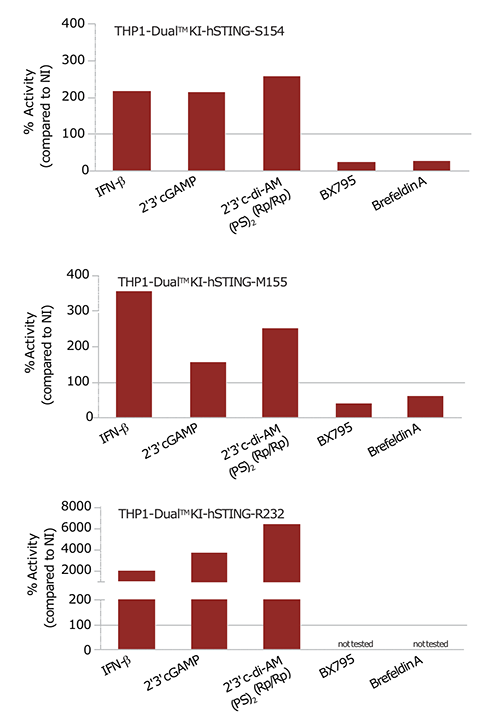 功能獲得(Gain-of-function)的活化-THP1-Dual? KI-hSTING-S154細(xì)胞和THP1-Dual? KI-hSTING-M155細(xì)胞均均可以持續(xù)活化ISG,而THP-1-Dual? KI-hSTING-R232卻不能。加入IFN-β或STING激動(dòng)劑將進(jìn)一步促進(jìn)ISG的活化。注意,結(jié)果已被非刺激細(xì)胞背景信號標(biāo)準(zhǔn)化。因?yàn)槠涑掷m(xù)活化STING的特性,SAVI細(xì)胞的背景非常高,誘導(dǎo)ISG應(yīng)答的增加倍數(shù)低于R232對照細(xì)胞。