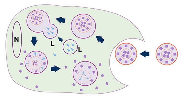圖. Clophosome?巨噬細(xì)胞耗竭的原理。包裹著氯磷酸的脂質(zhì)體Clophosome?借助巨噬細(xì)胞的內(nèi)吞作用進(jìn)入細(xì)胞,與溶酶體融合后,在磷酸酶的作用下,釋放出氯磷酸,當(dāng)細(xì)胞內(nèi)的氯磷酸濃度達(dá)到一定閾值,就會(huì)對(duì)巨噬細(xì)胞造成不可逆轉(zhuǎn)的損害,從而迫使其進(jìn)入細(xì)胞凋亡程序。