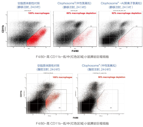 并且,在單次靜脈注射或腹腔注射0.2 ml Clophosome?(中性氯弗松)后自24小時(shí)起脾臟和肝臟中巨噬細(xì)胞耗竭可持續(xù)一周保持在80%以上,如果每4天注射一次,高效巨噬細(xì)胞耗竭可維持?jǐn)?shù)周之久。此外,Clophosome?-A(陰離子氯弗松),除保持了Clophosome?(中性氯弗松)所有優(yōu)點(diǎn)之外,更使得單次注射后巨噬細(xì)胞的耗竭率高達(dá)90%以上。