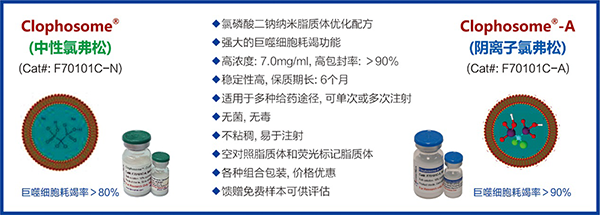 體內(nèi)巨噬細(xì)胞耗竭(in vivo macrophage depletion)是巨噬細(xì)胞功能研究的重要方法之一。FormuMax公司推出的Clophosome?系列產(chǎn)品就是將膜不通透性的氯磷酸鹽—氯磷酸二鈉(clodronate)包裹于脂質(zhì)體內(nèi)并帶入細(xì)胞,利用巨噬細(xì)胞的內(nèi)吞機(jī)制實(shí)現(xiàn)巨噬細(xì)胞的耗竭。