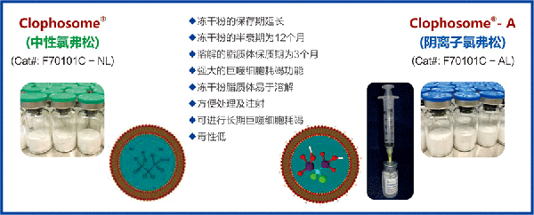 為了延長(zhǎng)脂質(zhì)體的保質(zhì)期,廠家已成功推出凍干粉狀的Clophosome?產(chǎn)品,其質(zhì)保期已延長(zhǎng)至12個(gè)月。通過(guò)簡(jiǎn)單的溶解,即可成功獲得氯磷酸鹽脂質(zhì)體。同樣,凍干粉狀的Clophosome?保持了與液態(tài)Clophosome?同樣杰出的巨噬細(xì)胞耗竭功能,以及活性高,使用方便,無(wú)菌無(wú)毒,以及高濃度,高包封率,不粘稠,無(wú)沉淀,易于注射等諸多優(yōu)越性能,尤其是凍干粉狀的Clophosome?克服了脂質(zhì)體保質(zhì)期短,穩(wěn)定性差的缺陷。