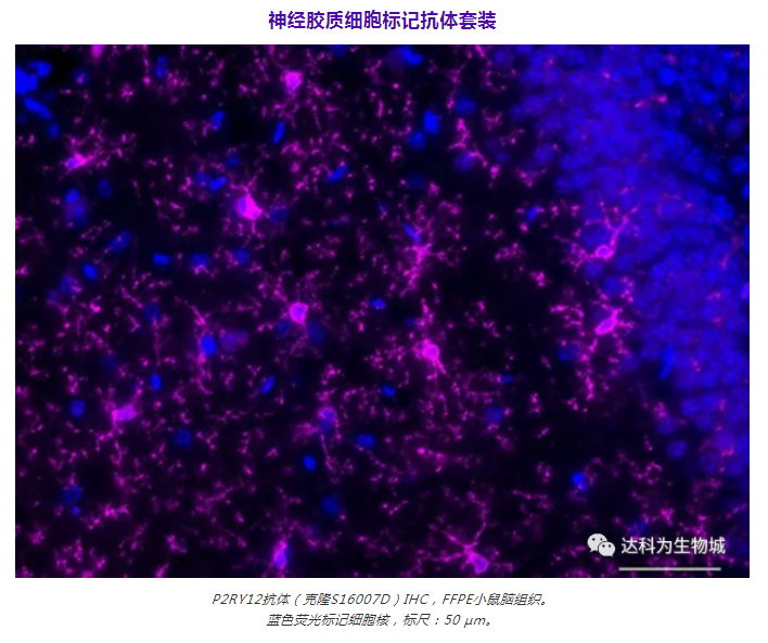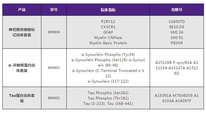 神經(jīng)膠質(zhì)細胞抗體套裝中包含檢測常見神經(jīng)膠質(zhì)細胞的標記物,如趨化因子受體1抗體(CX3CR1)、膠質(zhì)纖維酸性蛋白(GFAP)、髓磷脂(Myelin)和嘌呤能受體(P2RY12)。其中的輔助試劑可以檢測各種屬磷酸化或總α-突觸核蛋白/Tau,這些聚集物與阿爾茨海默癥和帕金森皆有重大關(guān)聯(lián)。