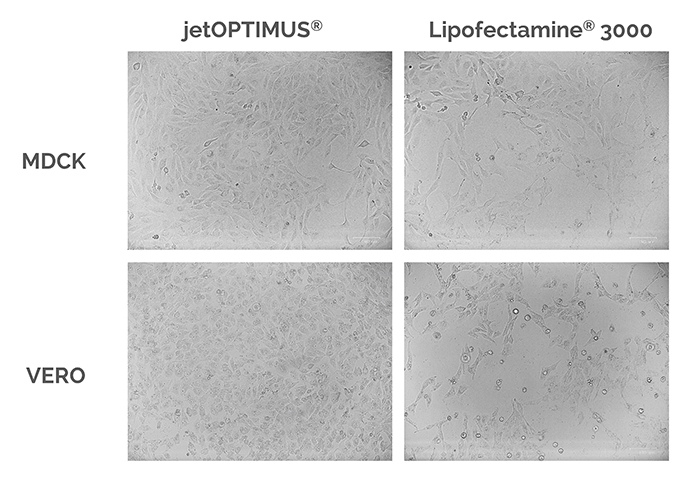 △圖2. 使用jetOPTIMUS?轉(zhuǎn)染24小時(shí)后,細(xì)胞仍然健康并保持良好形態(tài)。根據(jù)L3K和jetOPTIMUS?說明書要求進(jìn)行轉(zhuǎn)染,24小時(shí)后在相差顯微鏡下觀察MDCK和VERO細(xì)胞的狀態(tài)。
