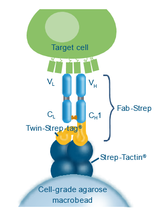 Fab-TACS柱子填充了包被有Strep-Tactin多聚體的細胞級瓊脂糖基質(zhì),偶聯(lián)上Strep-tagFab片段(Fab-Streps)特異性的結(jié)合到瓊脂糖基質(zhì)上。隨后,加入全血或其他血液制劑流過柱子。目的細胞通過特異性的與Fab-Streps作用從而結(jié)合到瓊脂糖基質(zhì)上,其他非目的細胞則有效的被洗去。最后,加入生物素使目的細胞從Fab-Streps上解離。至此,就已分離得到不帶任何標記的、真實的目的細胞可用于下游的實驗研究。
