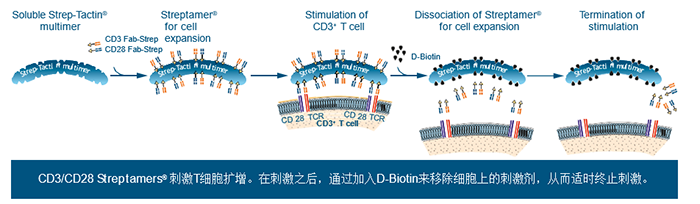 Streptamers?應用于T細胞擴增是目前T細胞擴增術(shù)中一項較新穎的技術(shù)。該技術(shù)的核心在于:將抗CD3和抗CD28Fab-Streps結(jié)合到Strep-Tactin多聚體上,使它們形成可溶性的蛋白復合物。在刺激之后,通過加入D-Biotin來移除細胞上的刺激劑,從而適時終止刺激。