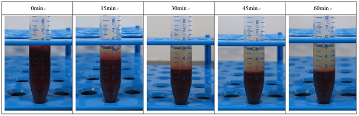 • 按照4:1的比例加入1mL 紅細胞沉降液,混勻,在室溫自然沉降。結(jié)果如下圖所示。