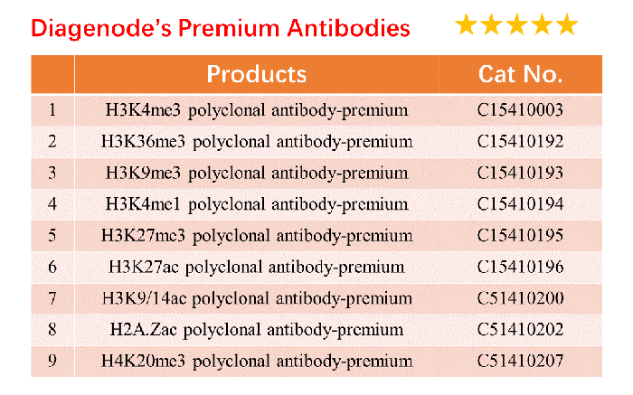 Diagenode的研發(fā)工作符合國際人類表觀基因組協(xié)會(IHEC)的總體目標。IHEC聯(lián)合會給出的建議指南在任何表觀基因組項目中繪制以下6個組蛋白修飾圖:H3K4me3,H3K9me3,H3K27me3,H3K27ac,H3K4me1和H3K36me3。H3K4me3和H3K9Ac這兩種組蛋白修飾通常富集在激活的啟動子區(qū)域上;H3K4me1和H3K27Ac這兩種組蛋白修飾通常富集在基因的增強子區(qū)域;H3K36me3和 H3K79me2這兩種組蛋白修飾通常富集在RNA聚合酶延伸區(qū)域 ;H3K27me3和H3K9me3這兩種組蛋白修飾用于抑制基因表達。
