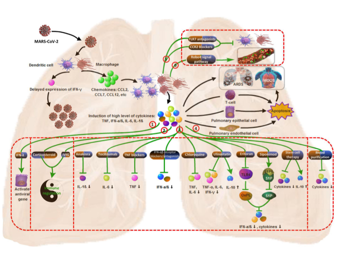 在細(xì)胞因子風(fēng)暴發(fā)生的過(guò)程中,有幾個(gè)比較重要的因子,IL-1、IL-6、 TNF、IFN、和CCL2,這些細(xì)胞因子或細(xì)胞趨化因子可通過(guò)與各自的受體結(jié)合,導(dǎo)致肺纖維化、內(nèi)皮功能障礙及炎癥反應(yīng)放大,最終擴(kuò)散至全身引發(fā)多器官功能衰竭。