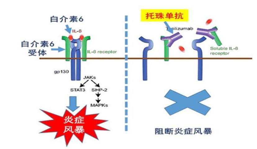 Tocilizumab(托珠單抗)是白介素-6(IL-6)受體阻斷劑,可與IL-6受體特異性結(jié)合,抑制其介導(dǎo)的信號(hào)傳導(dǎo),發(fā)揮抑制“炎癥風(fēng)暴”的作用。國(guó)家衛(wèi)健委發(fā)布了《新型冠狀病毒肺炎診療方案(試行第七版)》,首次提出在重型、危重型病例的治療中試用“托珠單抗”進(jìn)行免疫治療,適應(yīng)證為“雙肺廣泛病變者及重型患者,且實(shí)驗(yàn)室檢測(cè)IL-6水平升高者”。