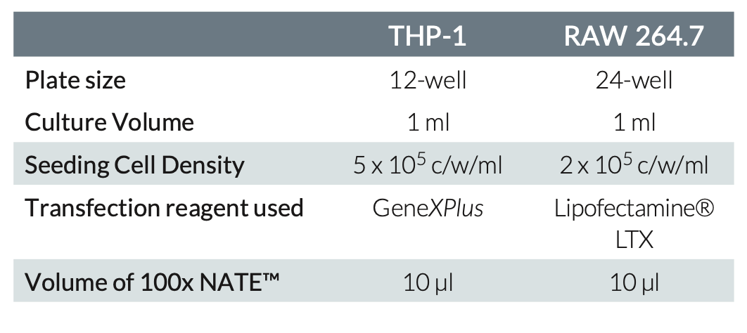(下表是使用NATE轉(zhuǎn)染THP-1或RAW264.7細(xì)胞的示例)