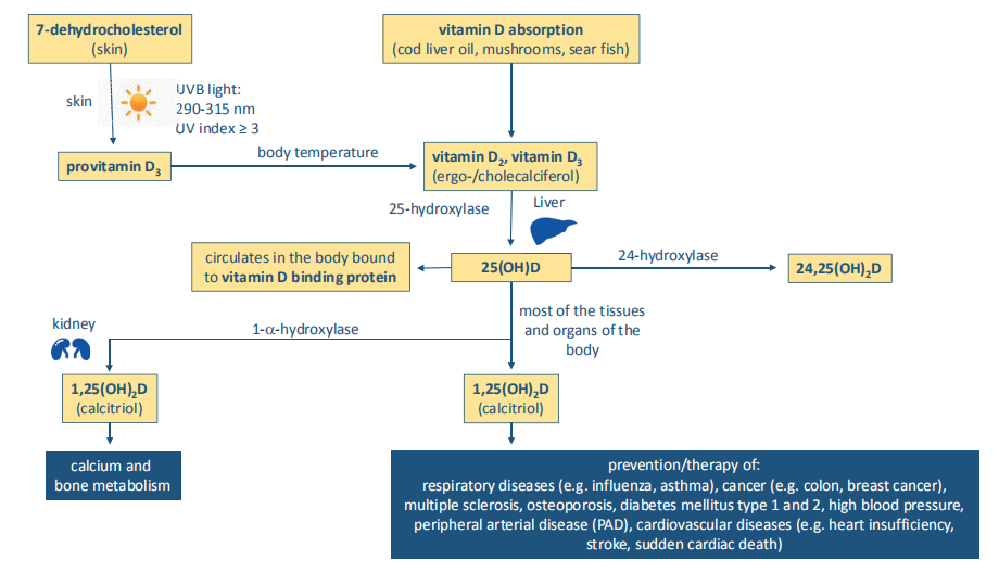 由于冬季紫外線水平低,維生素D的自我合成減少。這會增加所有類型的感染,例如呼吸道合胞病毒(RSV),流感病毒和SARS-CoV。在熱帶地區(qū),這種季節(jié)性是與雨季有關。不同的研究報告說,在慢性病患者中25-(OH)D3的濃度低于健康人。