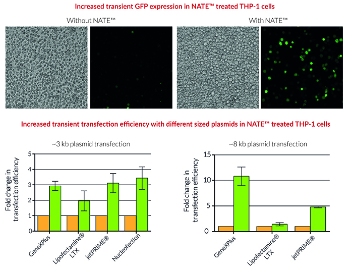 在真核細(xì)胞轉(zhuǎn)染期間,外源核酸(如質(zhì)粒DNA)的主要障礙是它們會(huì)被胞質(zhì)傳感器檢測(cè),如cGAS/STING,AIM2炎癥小體和LC3介導(dǎo)的自噬。這些防御性級(jí)聯(lián)信號(hào)的激活通常會(huì)導(dǎo)致低轉(zhuǎn)染效率、降低的細(xì)胞活力和不一致的結(jié)果,尤其是在難轉(zhuǎn)細(xì)胞(如免疫細(xì)胞)的轉(zhuǎn)染實(shí)驗(yàn)中。NATE?抑制許多核酸感應(yīng)途徑,從而保護(hù)外源DNA并促進(jìn)其表達(dá)。