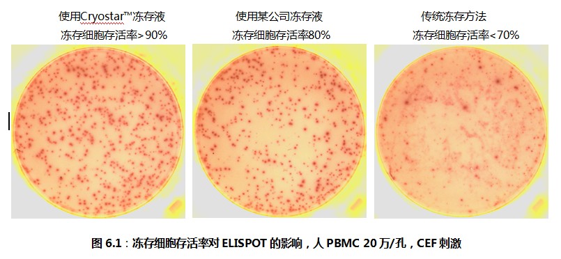 考慮到ELISPOT檢測的特殊性,荷蘭U-CyTech公司經(jīng)過精心的研究與反復的驗證,推出Cryostar?凍存試劑盒,在凍存液中添加了一系列對細胞有特殊保護作用的保護劑。達科為公司在接到Cryostar?凍存試劑盒之后,在我們的實驗室以及國內數(shù)家客戶的實驗室做了細胞凍存與復蘇的實驗,并且對復蘇之后的細胞做了ELISPOT檢測。結果表明,淋巴細胞的存活率超過90%,ELISPOT斑點形成頻率與新鮮細胞完全相同。參見圖6.1。