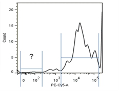 補(bǔ)償調(diào)節(jié)抗體的正確選擇對于熒光通道之間的補(bǔ)償調(diào)節(jié)是非常重要的。要求選擇的抗體所結(jié)合的抗原分子在樣本細(xì)胞中有明確表達(dá),占樣品細(xì)胞的10%以上,50%以下。如果陽性細(xì)胞比例太低,在陽性細(xì)胞區(qū)域無法形成明顯的細(xì)胞團(tuán),無法判斷調(diào)節(jié)是否合適。如陽性細(xì)胞比例過高,則不表達(dá)該抗原的陰性細(xì)胞無法形成明顯的細(xì)胞團(tuán),如圖1-4直方圖所示。