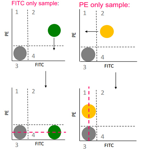 對于熒光補(bǔ)償?shù)拇_定,需運(yùn)用以上補(bǔ)償?shù)幕驹聿⒔Y(jié)合特定的標(biāo)本來實(shí)現(xiàn)。以FITC,PE雙色分析為例: