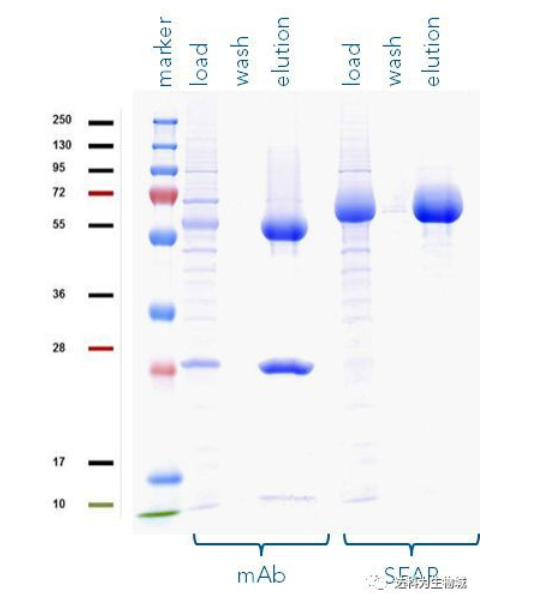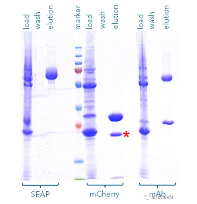 此外,我們也測(cè)試了其他的蛋白,例如SEAP(72 kDa)或抗體(mAb,其重鏈為55kDa)。圖B為以Strep-Tactin?XT純化SEAP-TST、mCherry-TST與mAb-TST的SDS-PAGE分析結(jié)果,可見對(duì)于不同蛋白,Strep-tag?系統(tǒng)都能純化出高純度的目標(biāo)蛋白。(注:紅色標(biāo)記處為 mCherry的降解產(chǎn)物,非雜帶)