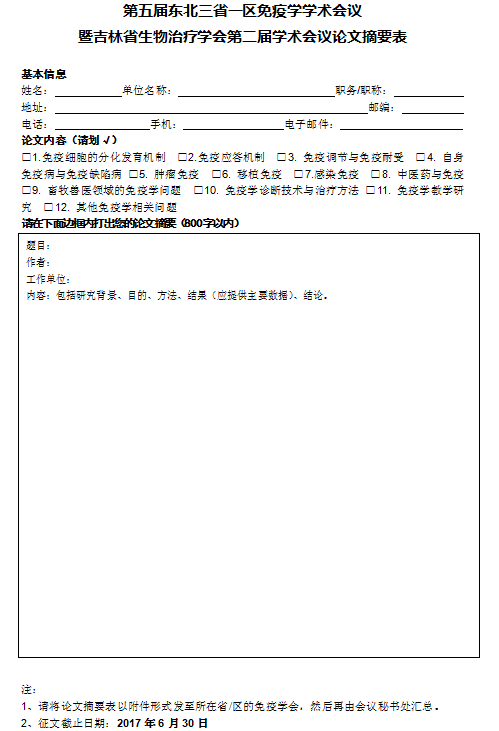 2. 請使用《第五屆東北三省一區(qū)免疫學(xué)學(xué)術(shù)會議論文摘要表》撰寫來稿。